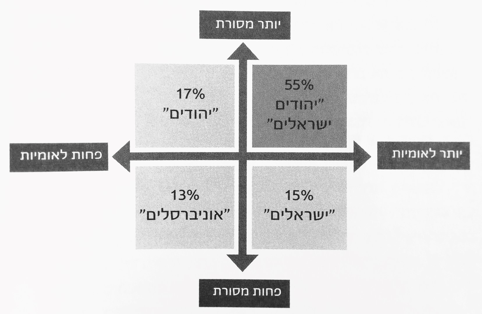 יש כאן ארבע קבוצות, הנוצרות מחיתוך של שני צירים: אחד הוא בין 'יותר לאומיות' ל'פחות לאומיות' (או 'יותר אוניברסליזם'), השני הוא בין 'יותר מסורת' ל'פחות מסורת' (או 'יותר חילון'). שקלול הממצאים האמפיריים מהמחקר מעלה כי יותר ממחצית מהיהודים הישראלים (55%) הם בעלי זיקה רבה הן ללאומיות ישראלית/יהודית והן למסורת יהודית. החוקרים מכנים קבוצה זו, שהיא למעשה הזרם המרכזי (מיינסטרים) של החברה, 'יהודים ישראלים'. יתר החברה נחלק לשלוש קבוצות מיעוט כמעט שוות בגודלן, לפי הסדר הבא: