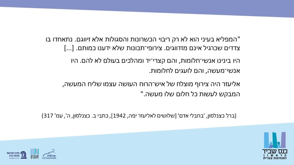 הצבעתי על 'שרשרת המסירה' של הזהויות ההיברידיות מהספדו של ברל כצנלסון על אליעזר יפה, דרך הספדו של נתן אלתרמן על ברל, ומשביד (שכמובן כתב על אלתרמן) אלינו.