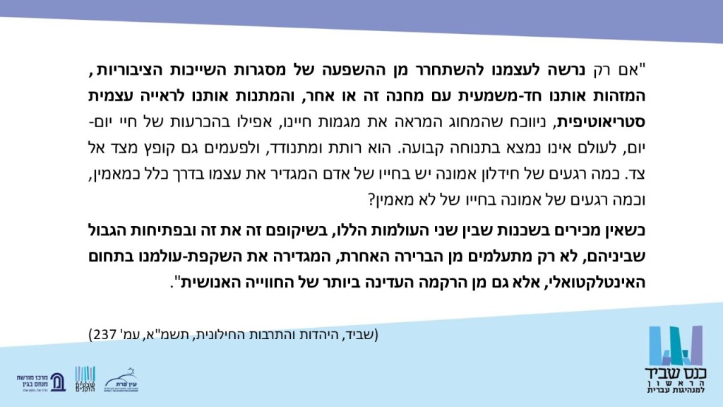את דבריי בכנס הקדשתי לאחד ההיבטים החשובים בעיניי בהגותו ובחייו של שביד – מיזוג התכונות, תחומי העשייה והנטיות. שביד סירב באופן עקבי ועיקש להגביל את עצמו להבחנות בין מחקר אקדמי לבין יצירה עצמאית או גיבוש אורחות חיים ואמירות רלוונטיות לאקטואליה. כך גם סירב לקבל תכתיבים לחיים הרוחניים, הנובעים כביכול מכותרת-הזהות של 'חילוני' או 'דתי'.